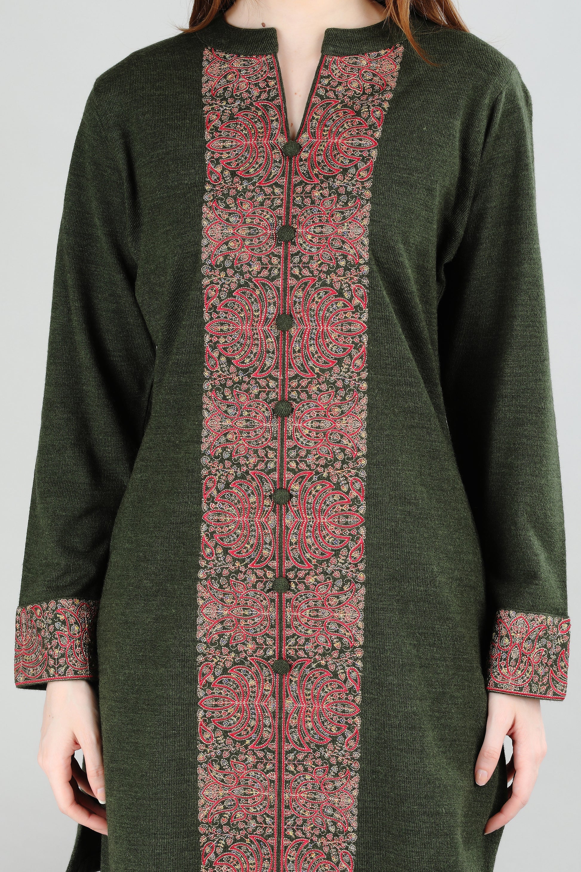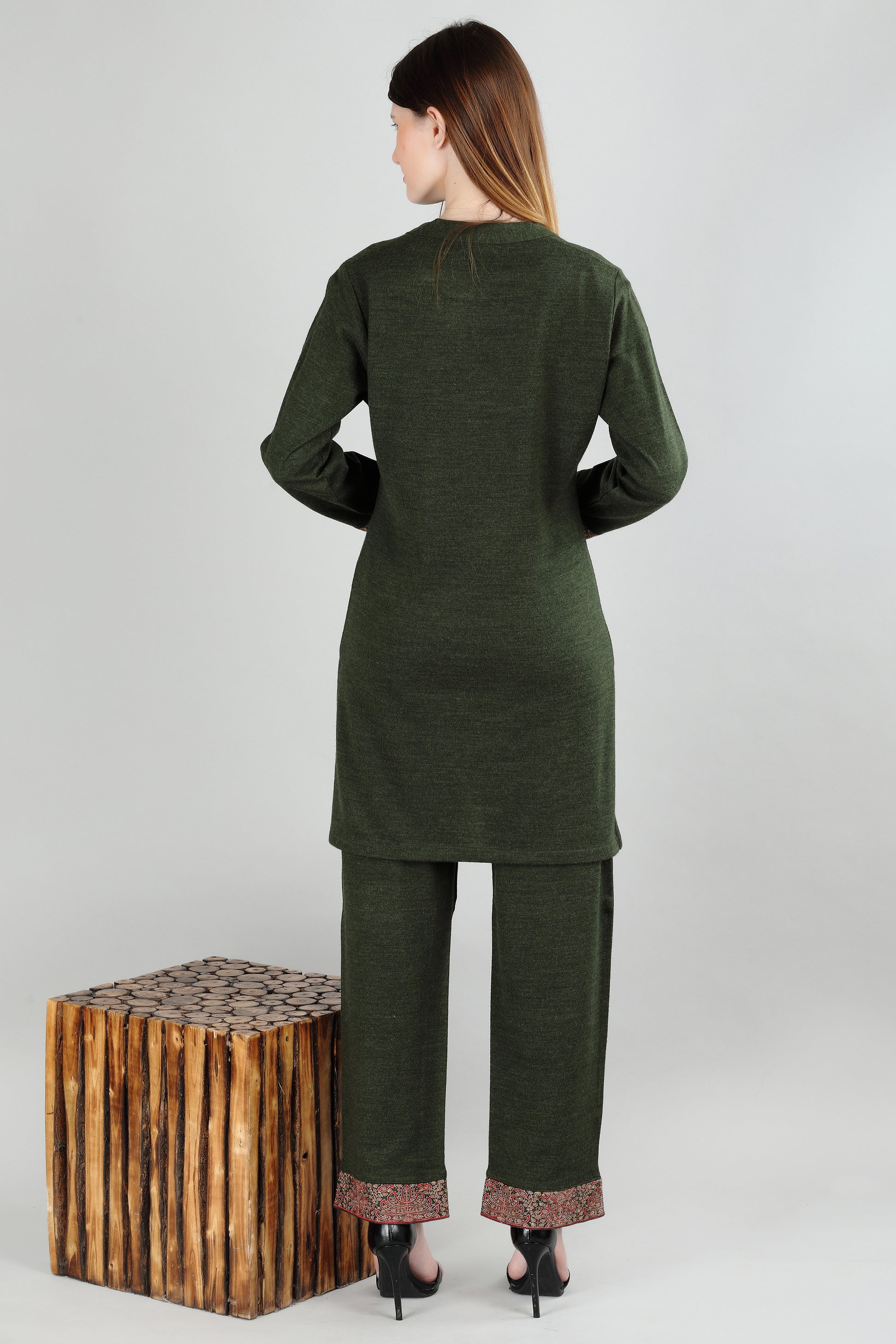 Elegant green cord set featuring beautiful decorative trim detailing. This sophisticated matching set includes a long tunic top with intricate patterned trim and coordinating straight-leg pants with matching trim accents. Perfect for special occasions and elegant casual wear.